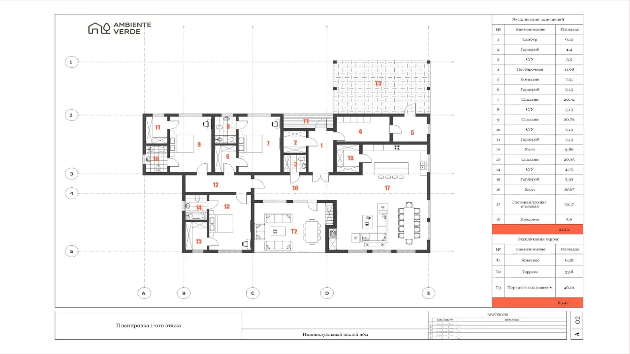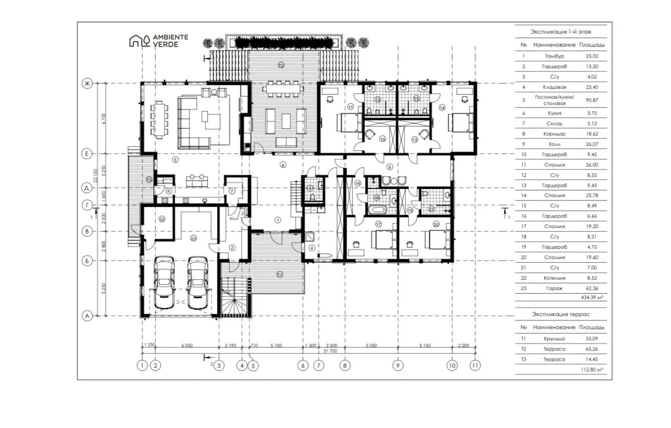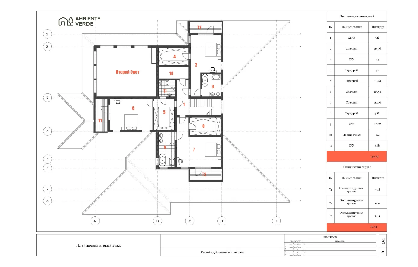 Проект дома «Verde» представляет собой дом с тремя мастер-спальнями, каждая с собственной ванной комнатой и гардеробной, что гарантирует исключительное удобство и приватность.